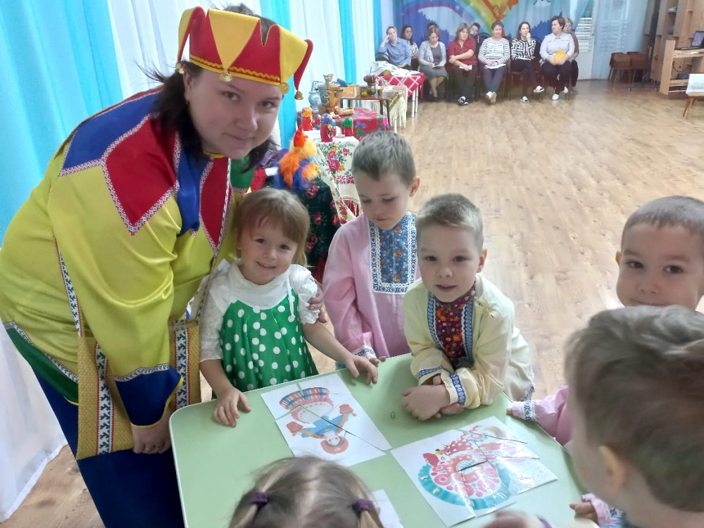 В этом учебном году в детском саду активно решается задача "Приобщать детей к истокам народной культуры". В связи с этим, 7 декабря в средней группе "Березка" (музыкальный руководитель Шлыкова М.В.,.воспитатель Артемьева Е.Ю., помощник воспитателя Арефьева Е.В.) прошло открытое мероприятие - фольклорное развлечение "Веселая ярмарка". Дети окунулись в атмосферу настоящей русской ярмарки: играли, пели, отгадывали загадки, читали потешки с веселым Скоморохом. Познакомились с историей рождения Дымковской игрушки. Украшением праздника стали яркие костюмы, выставка изделий из бересты, дымковские игрушки.В завершении праздника Скоморох угощал всех: и детей, и гостей. Веселая ярмарка никого не оставила равнодушным: было интересно, весело, забавно и радостно!
