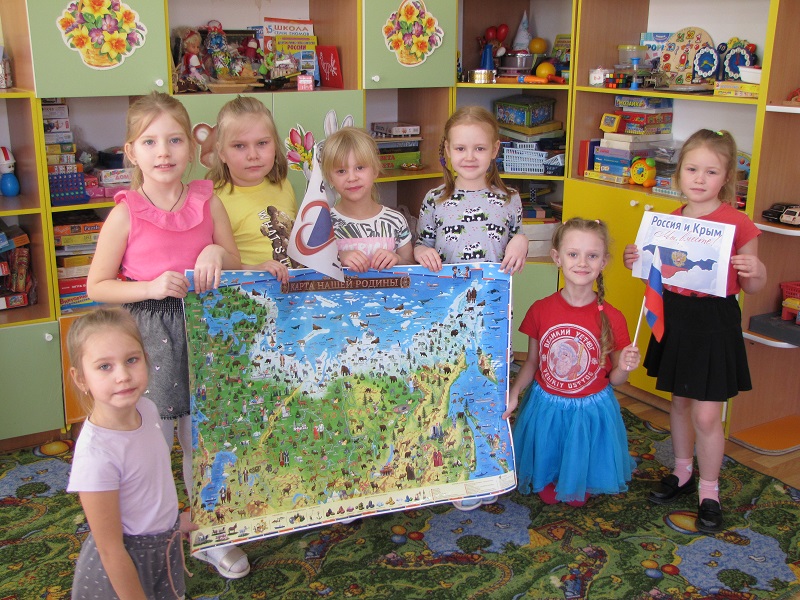 В подготовительной группе «Фиалка» ( воспитатель Лекандер С.А.) прошла беседа и просмотр презентации «Крымская Весна. Воссоединение Крыма с Россией».Дети закрепили знания о символике России и Крыма, повторили пословицы и поговорки, прочитали стихи, рассмотрели карту России.