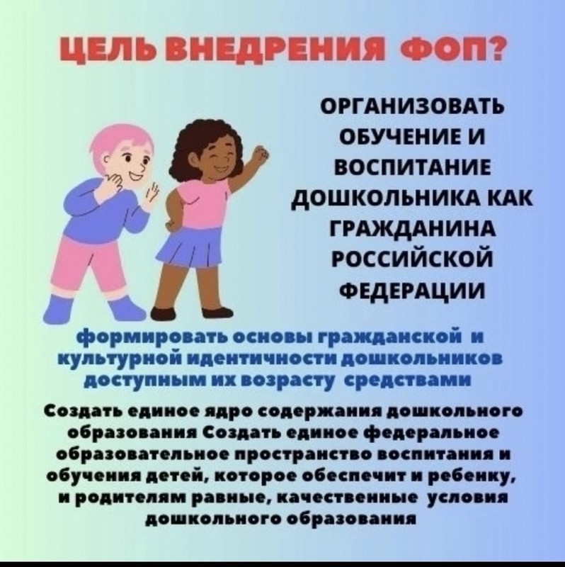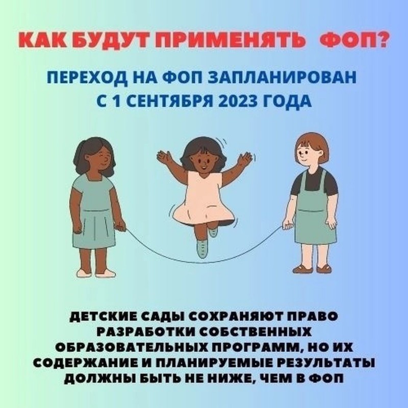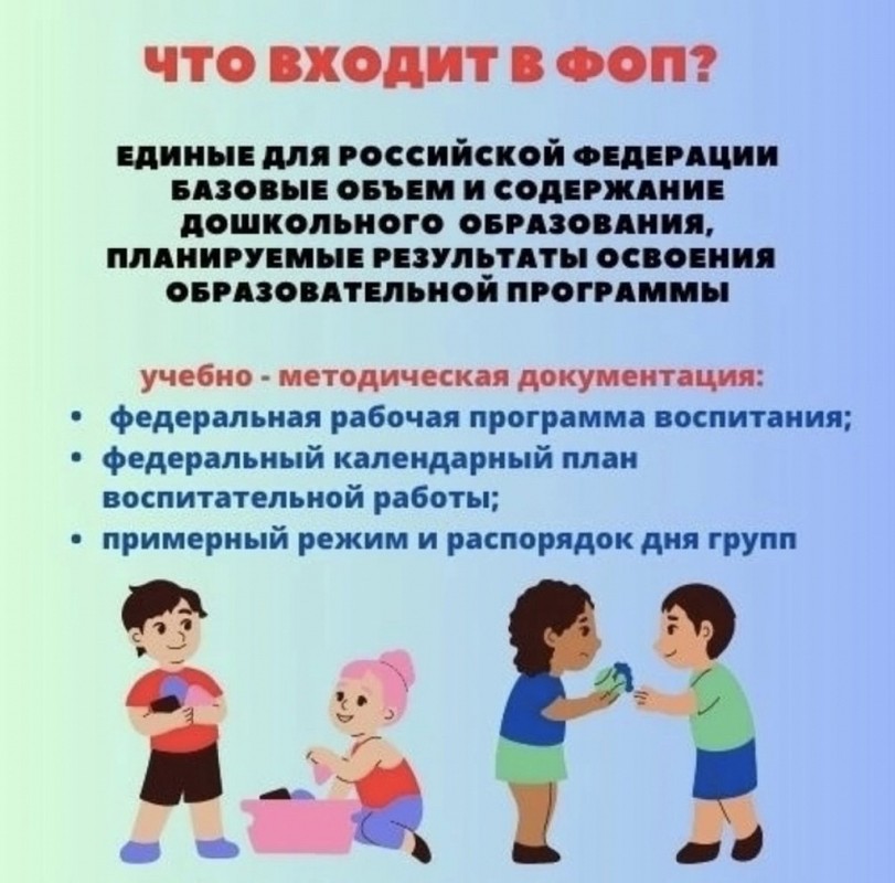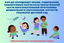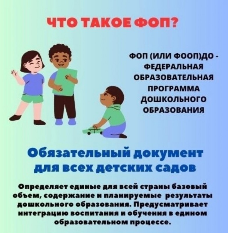 Уважаемые родители! С 1 сентября 2023 года все дошкольные учреждения начали работу по новой федеральной образовательной программе дошкольного образования (ФОП ДО). ФЕДЕРАЛЬНАЯ ОБРАЗОВАТЕЛЬНАЯ ПРОГРАММА ДОШКОЛЬНОГО ОБРАЗОВАНИЯ – это обязательный для всех детских садов документ утвержден Приказом Минпросвещения от 25.11 2022г. № 1028. ФОП ДО определяет единый для всей страны базовый объем, содержание, планируемые результаты обязательной части образовательной программы дошкольного образования, которую реализует детский сад. Предусматривает интеграцию воспитания и обучения в едином образовательном процессе. ФОП ДО заменяет все другие программы, действующие на данный момент.